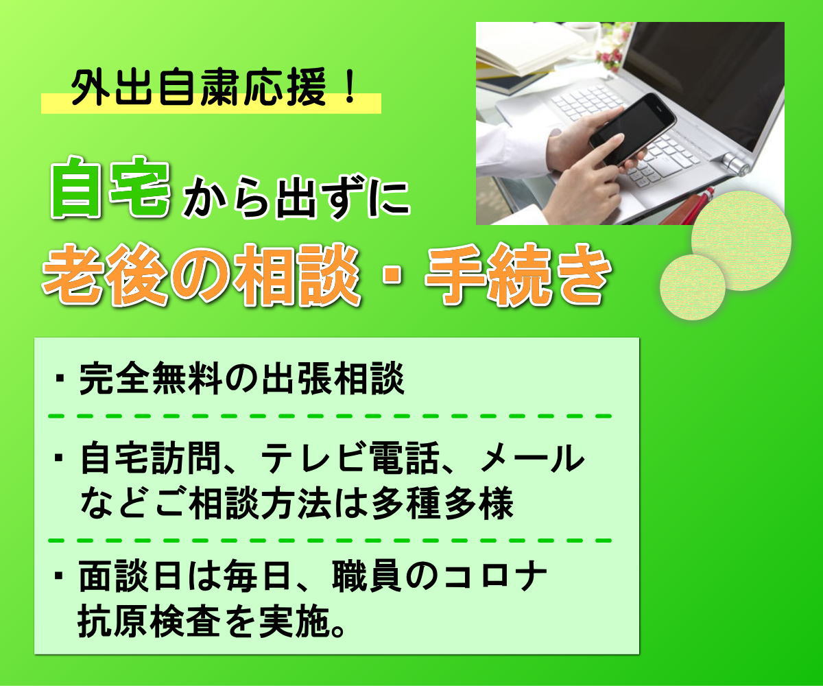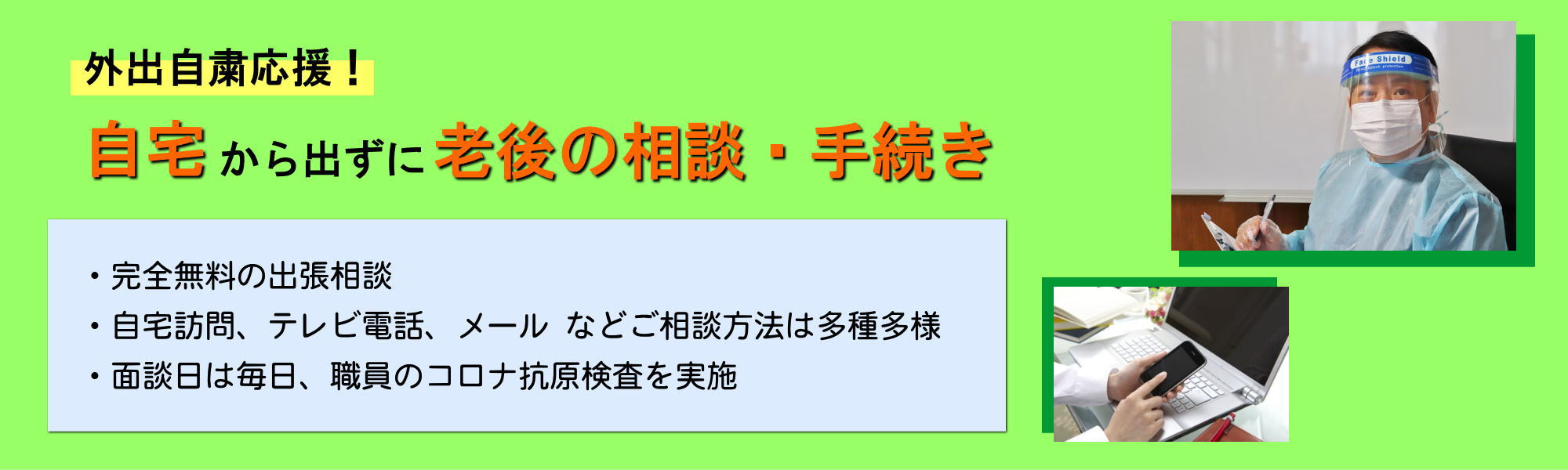 外出を控えたいとお考えのお客様に向け、ご自宅、施設、ご近所への出張相談を実施しております。これによりご相談者様はご自宅や施設より一歩も出ずにご相談をいただくことが可能になり、感染リスクを限りなく小さくすることができます。